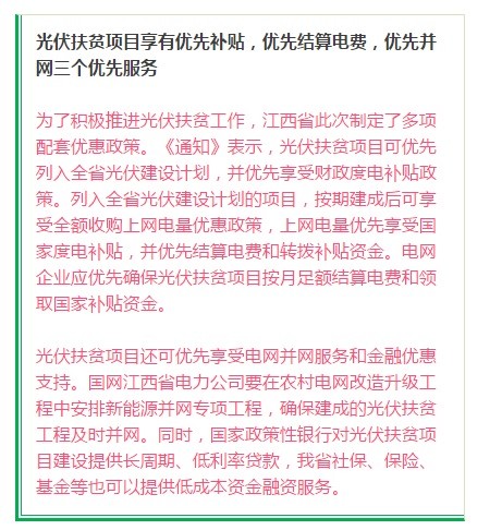 据了解,作为光伏产业大省,江西省实施光伏扶贫新模式,既扩大了光伏应用的新领域,也开拓了扶贫工作的新途径,具有明显的综合社会效益。相关统计表示,一个光伏扶贫项目可让贫困户每年增加3000元左右的“阳光收入”。2015年8月开始,上犹县在全省率先启动光伏扶贫项目建设。此后,南昌、上饶等地也相继出台了光伏扶贫工程规划。