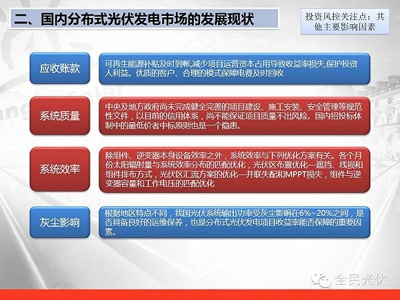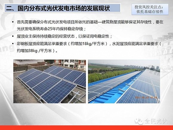 而收益其中的一个点,就是依托基础的存续性。这个可以分为两个方面来说,一个是屋顶本身的存续,也就是屋顶的承重和拆迁问题, 如果保证一个25 年持续稳定收益的话,首先要保证屋顶能够撑住 25 年,另一个就是业主能存续 25 年,不会跑掉。这样起码在一个 20 年的 PPA 里收益可以得到保证。