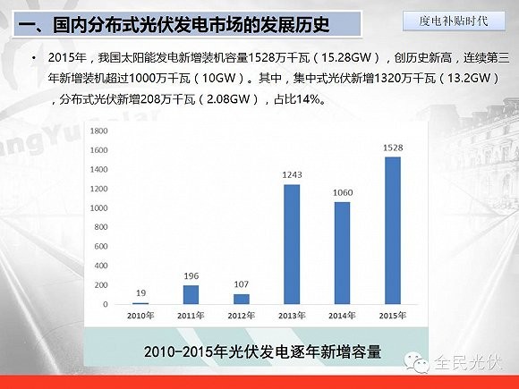 从 2013 年有了国八条以后, 2014、 2015 两年开始有度电补贴的分布式了, 2015 年一共做了 15.28GW, 创了新高, 这已经是连续第三年超过 10GW 的总量了,但是我们可以看到,其中真正的分布式只做了 2GW 左右,占比 14%。