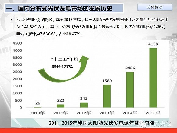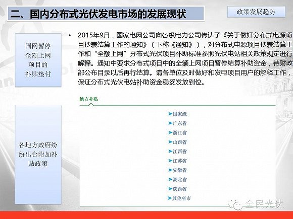 15 年 9 月份,国家电网底下的地方公司纷纷收到总部传来的通知,根据这个通知,全额上网的脱硫煤标杆电价以外的剩余补贴部分不再由电网垫付,全额上网的分布式项目也需要走集中式光伏电站的补贴申请目录才可以拿到补贴,但由于补贴目录的申请流程复杂,补贴到位滞后时间甚至超过 2 年,因此给分布式的发展带来了致命的打击。