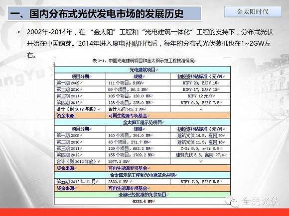 国内的分布式事实上做的还是比较早, 只是早期多以示范项目为主,比如科技方面示范的离网项目,或是一些小型的并网项目。真正发展可能还是09年,即金太阳时期。从 09 年到 12 年,金太阳加 BIPV, 一共批了 6+GW, 但只做了其中的一半甚至还不到。