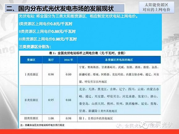 全额上网的上网电价其实是一刀切,跟集中式地面电站是一样的上网电价,是按照我们的光照辐照度进行分区。国家分成了一类、二类、三类 3 个区。 我们的东部地区绝大部分是 0.95 元和 1 元/kwh 的价格,在 2016 年 1 月 1 日 以后就进行了上网电价调整,现在东部地区的上网电价一般是 0.88 元或 0.98 元/kwh。