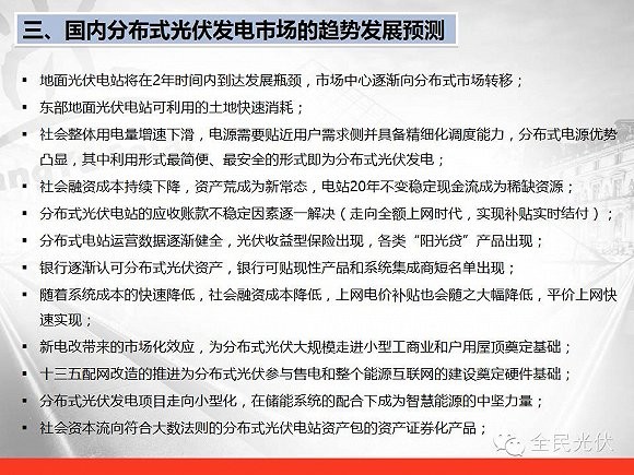 全额上网收益虽然低于自发自用,但因其购售电关系的简单、信誉度高,可以保证 20 年稳定的收益现金流,我认为这是分布式最终的发展必然趋势。今后的光伏直供电、光伏电力交易等形式事实上都是一种全额上网的方式。