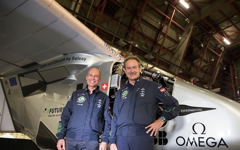 6月13日,在美国纽约肯尼迪国际机场,全球最大太阳能飞机“阳光动力”2号飞行员贝特兰德·皮卡德(左)和安德烈·博尔施贝格在飞机前留影。新华社记者李木子摄