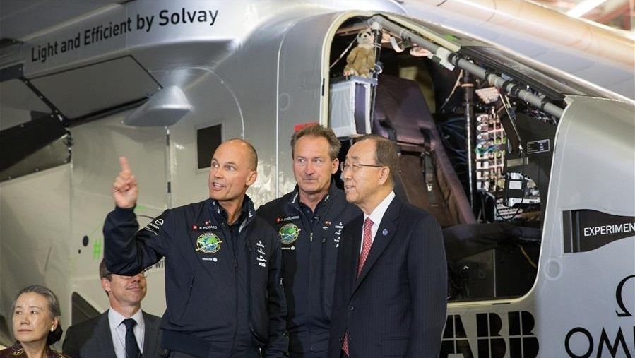 当日,联合国秘书长潘基文在美国纽约肯尼迪国际机场会见了全球最大太阳能飞机“阳光动力”2号飞行员贝特兰德·皮卡德和安德烈·博尔施贝格。正在进行环球飞行的“阳光动力”2号于6月11日抵达纽约。“阳光动力”2号随后将跨越大西洋抵达欧洲,最后返回出发地阿联酋阿布扎比,完成环球之旅。新华社记者李木子摄