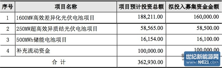 预案公告中,记者发现,18.82亿元将用于建设1.6GW的高效差异化电池项目,募资约16亿元;250MW的超高效异质结(下称“HIT”)光伏电池则需5.85亿元;500MWh储能电池项目的募资1.61亿元,此外10亿元用于补充流动资金。