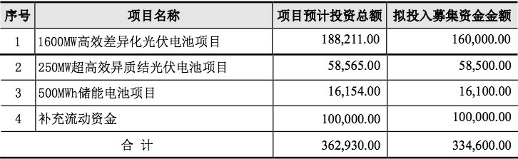 预案公告中,记者发现,18.82亿元将用于建设1.6GW的高效差异化电池项目,募资约16亿元;250MW的超高效异质结(下称“HIT”)光伏电池则需5.85亿元;500MWh储能电池项目的募资1.61亿元,此外10亿元用于补充流动资金。