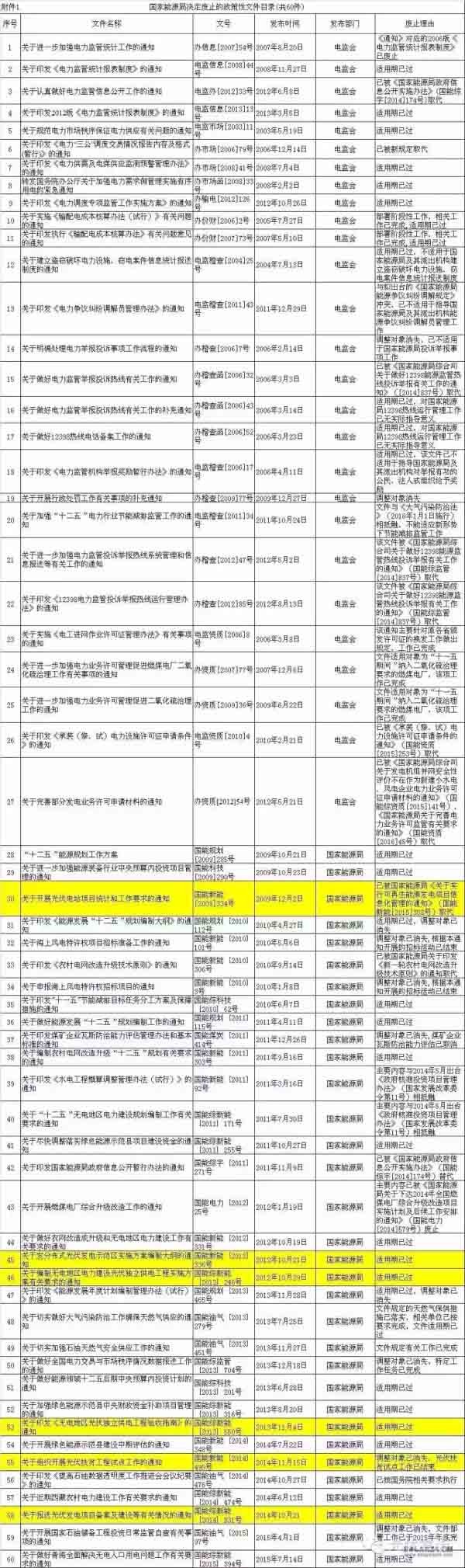 根据《关于做好行政法规部门规章文件清理工作有关事项的通知》(国办函[2016]12号)的要求,我局对不利于稳增长、促改革、调结构、惠民生的规章和政策性文件进行清理。经清理,现决定废止《关于进一步加强能源装备行业中央预算内投资项目管理的通知》等60件文件,修改《关于加强水电建设管理的通知》等42件文件(具体见附件1、附件2),现予公布。