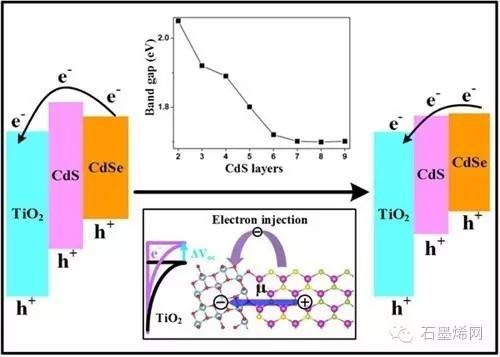 最近北大新材料学院的潘锋教授团队与中国科学院化学研究所林原教授团队合作,通过第一性原理和实验发现,TiO2/CdS/CdSe QDSSCs的光电转化性能可以通过液相原子层技术调控CdS缓冲层的原子层数来实现,最高效率能达到6%,接近该体系目前最高水平(6.01%)。他们发现随着CdS层数的增加,一方面CdS的带隙减小,CdS的导带底向下移动;另一方面,TiO2/CdS界面偶极作用增强,更多电子注入TiO2,导致TiO2的导带底向上移动,从而导致界面处各自的能级发生重排。因此,QDSSCs的开路电压和短路电流可以通过调控缓冲层的层数实现。这些发现将为以后如何优化缓冲层的界面性质来提高QDSSCs的表现性能提供重要的线索和指导。该工作近期发表在国际著名期刊Chemical Communications发表(DOI: 10.1039/C6CC01664B),北大新材料学院的张丙凯、郑家新以及中科院化学所李晓宁博士是文章的共同第一作者。潘锋教授和林原教授是共同通讯作者。