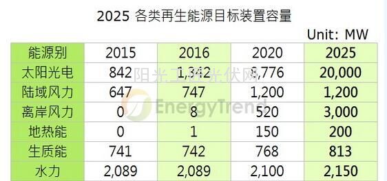 经济部能源局去年所提出的2025再生能源发展目标为17.25GW,包含太阳能8.7GW、风力发电5.2GW。经济部新团队所揭露目标大幅高出原目标。在太阳光电目标装置容量方面,今年底累积装机目标为1,342MW,亦即今年度应再安装500MW、2020年达8,776MW,并于2025年达成20GW的最终目标。(见下表)