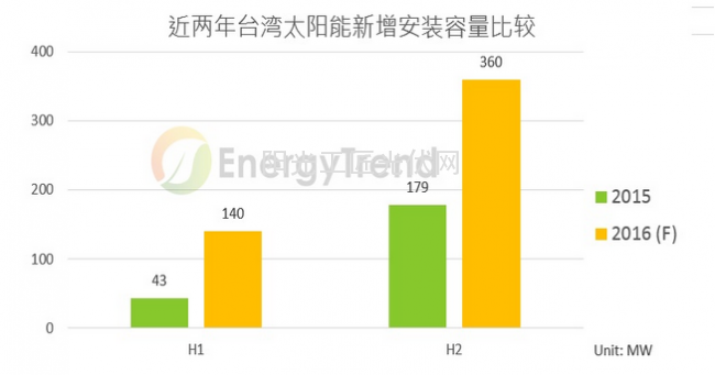 若今年度需完成500MW,与2015年同期相较,装设速度和新增设备的幅度应倍增。根据能源局公布的资料,台湾到今年4月底止,太阳能系统累积安装容量仅929MW,新增安装容量仅86MW。除非H1达140MW、H2达360MW安装容量,否则今年内新增500MW安装容量仍有难度。