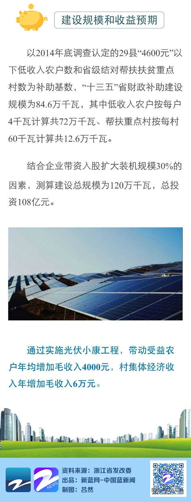 据了解,“十三五”期间,浙江光伏小康工程总投资为108亿,将带动120万千瓦光伏建设规模,受益农户年均增加毛收入4000元,村集体每年将增加毛收入6万元。