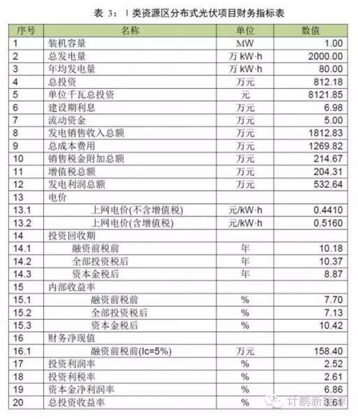 Ⅰ类资源区分布式光伏项目财务指标表