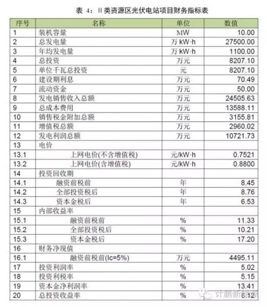 Ⅱ类资源区光伏电站项目财务指标表