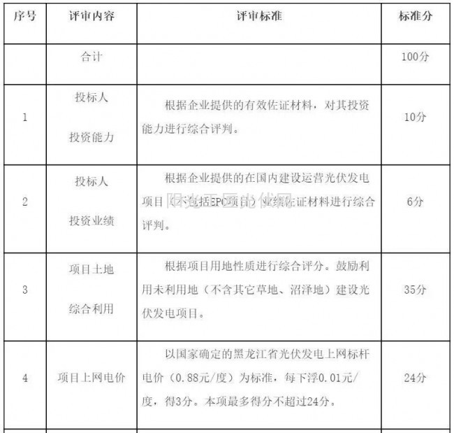 以国家确定的黑龙江省光伏发电上网标杆电价(0.88元/度)为标准,每下浮0.01元/度,得3分。本项最多得分不超过24分。