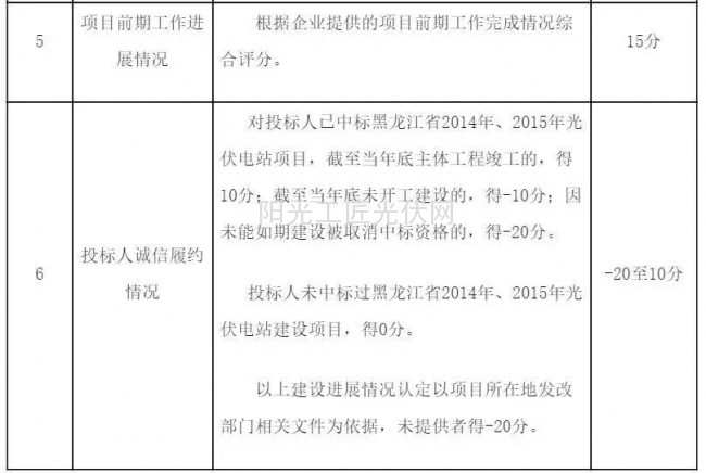 对投标人已中标黑龙江省2014年、2015年光伏电站建设项目,截至当年底主体工程竣工的,得10分;