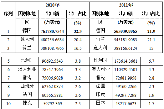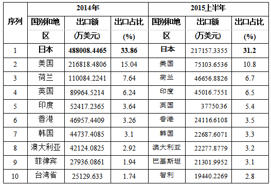 表2-4 2010年~2015上半年我国出口市场变化情况