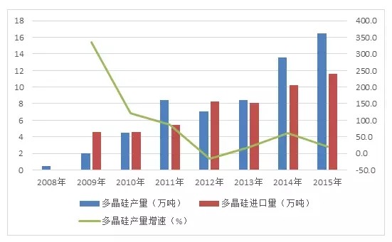图2 2008~2015年我国多晶硅产量及增速