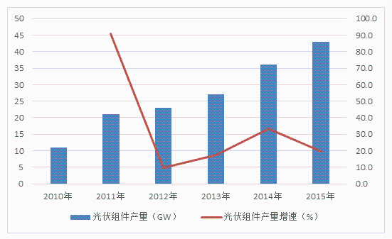 图3 2010~2015年我国光伏组件产量及增速