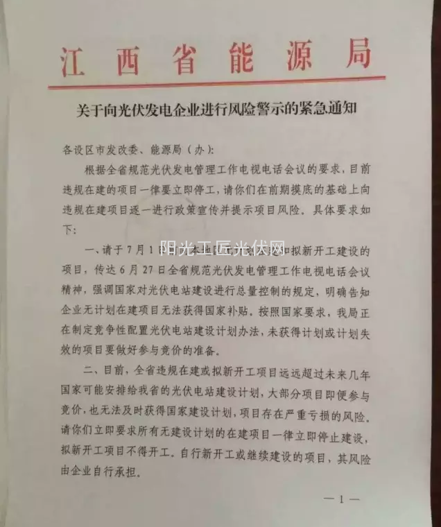 二、目前,全省违规在建或拟新开工项目远远超过未来几年国家可能安排给我省的光伏电站建设计划。大部分项目即便参与竞价,也无法及时获得国家建设计划,项目存在严重亏损的风险。请你们立即要求所有无建设计划的在建项目一律立即停止建设,拟新开工项目不得开工。自行新开工或继续建设的项目,其风险由企业自行承担。