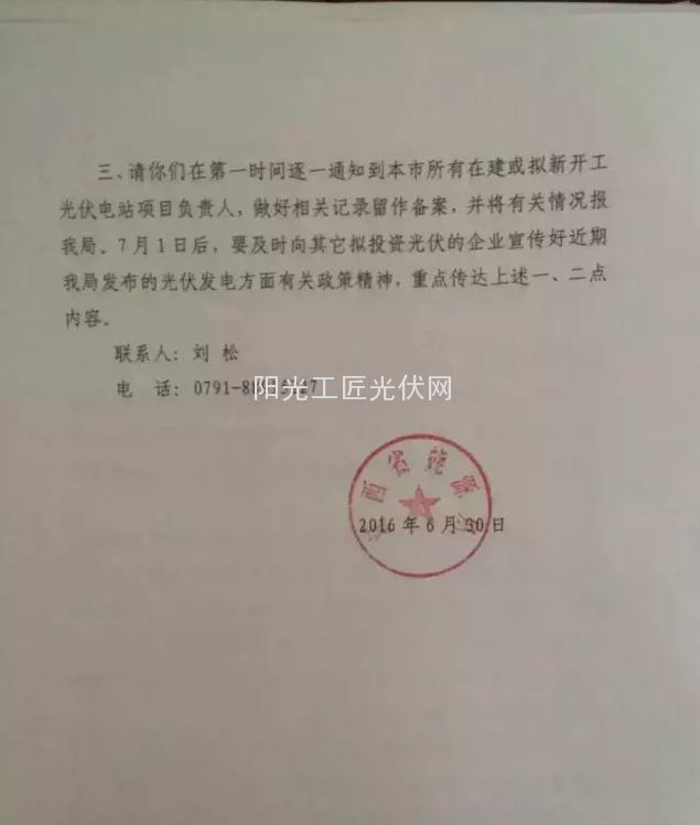 三、请你们在第一时间逐一通知到本市所有在建或拟新开工光伏电站项目负责人,做好相关记录留作备案,并将有关情况报我局。7月 1日后,要及时向其它拟投资光伏的企业宣传好近期我局发布的光伏发电方面有关政策精神,重点传达上述一、二点内容。