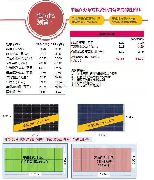 单块60片电池封装的组件,单晶比多晶功率平均高出15W。