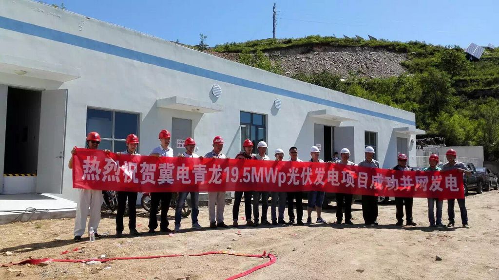 冀电青龙光伏电站工程建设规模19.5MWp,位于宏伟项目西北5公里,站址为山地地形,山体坡度校缓,山顶平台平坦开阔。地面植被较为茂盛,多为低矮枯草和少量林地,覆盖层较厚,这也为电站建设带来一定困难。2015年10月7日开工,2015年12月31号通过市质监站、2016年1月15日市电力公司验收,21公里外线已经全部竣工,于2016年1月31日成功倒送电。2016年6月7日通过电科院验收,2016年6月24日10个单元正式并网发电,年均发电量约27027.01MWh。