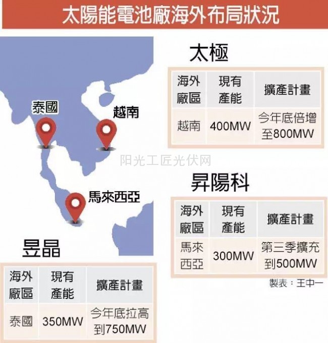 在昱晶方面,目前泰国厂的产能约350MW,预计今年底将拉高到750MW,届时加上台湾厂的1.5GW,合计的产能将达2.25GW。至于升阳科与合资伙伴在马来西亚的厂区有三条电池生产线、产能为300MW,预计第3季增至五条,使当地产能扩大到500MW。