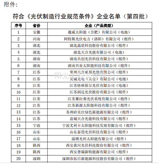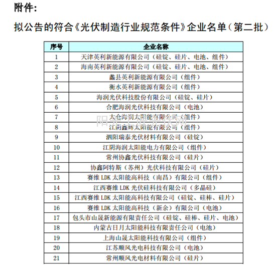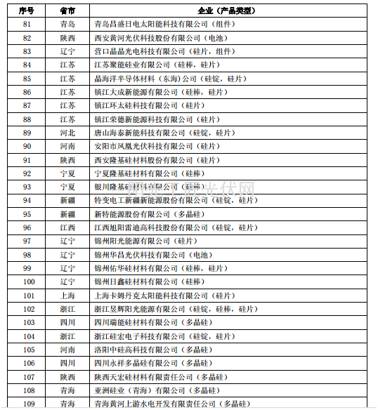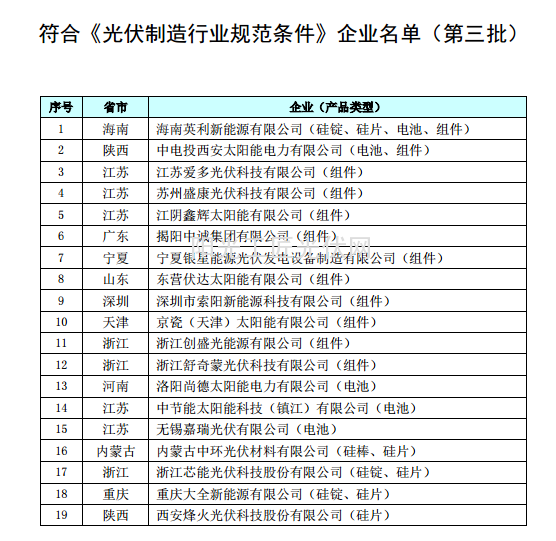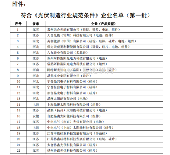 按照《国务院关于促进光伏产业健康发展的若干意见》的要求,以及根据《光伏制造行业规范条件》和《光伏制造行业规范公告管理暂行办法》,经企业申报、省级工业和信息化主管部门核实推荐、专家复核、网上公示及现场抽检,现将符合《光伏制造行业规范条件》企业名单(共5批)予以公告: