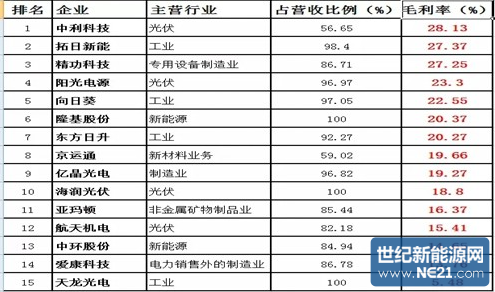 表一:15家A股上市的光伏企业主营业务毛利率排行(2015财年)