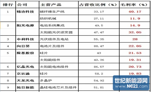 表二:15家A股上市的光伏企业主营产品毛利率排行(2015财年)
