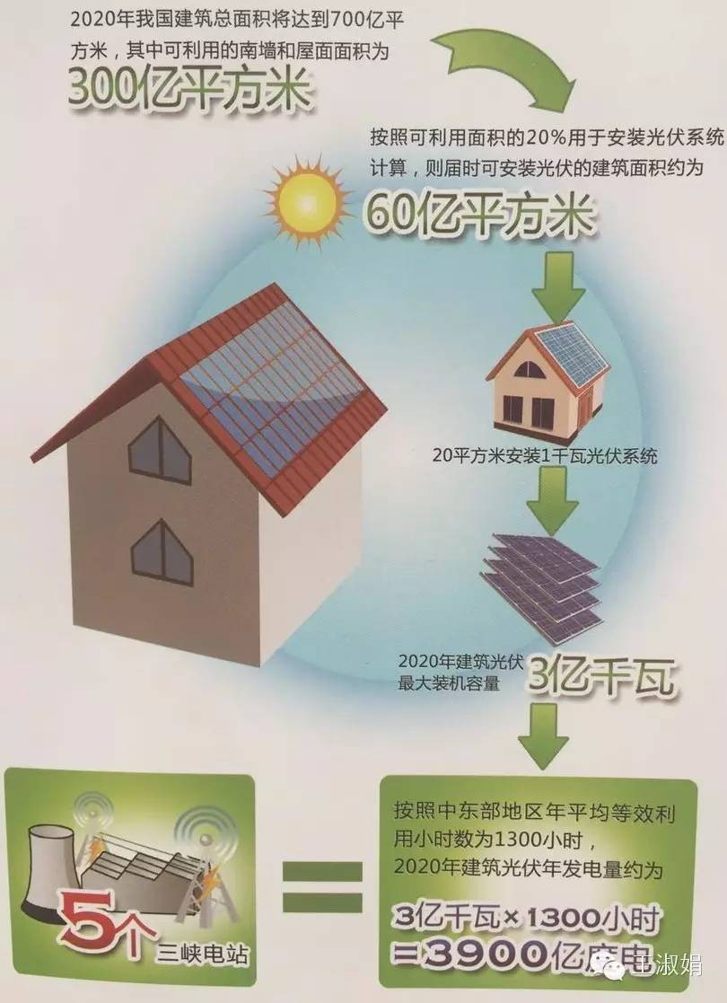 按照国家住宅与居住环境工程技术研究中心推算数据,2020年我国建筑总面积将达到700亿平方米,其中可利用的南墙和屋面面积为300亿平方米,按照可利用面积的20%用于安装光伏系统计算,则届时可安装光伏系统的面积约为60亿平方米。根据每20平方米安装1kW光伏系统计算,2020年建筑光伏系统最大装机容量可高达3亿kW。由于80%的屋面面积位于我国中东部地区,因此建筑光伏的主要建设区域在中东部地区。按照中东部地区平均年等效利用小时数为1300h,2020年建筑光伏年发电量约为:
