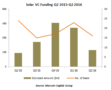 Mercom Capital关于太阳能资金和并购(M&A)活动的最新报告显示出太阳能行业形势并非一片大好。2016年第二季度,风险投资资金减少了一半以上,而债务融资相比于上一季度下降了43%。公开市场融资还维持在1.79亿美元,比上一季度翻番,但去年同期下降10%。