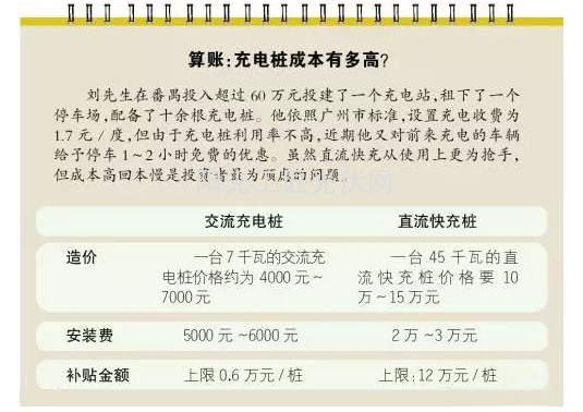 在使用频率高一些的地方,如新能源车推广力度最大的北京,情况也不算理想。富电科技工作人员对记者表示,当前该公司投建的现有的充电桩,日用频次大概能达到3次~4次,个别密集地区偶尔才能达到8次,并未达到预期。“假设在使用率较高的地区,每个直流桩利用次数为8次/天,充电服务费为0.8元/度、充电量约20度/次,算下来一个直流桩的年充电和服务费合计超过4.5万元。扣除每个快充的投入成本,也要五年才能回本。”当然,如果各地30%补贴标准能到位,那么至少可以抵消1~2年运营成本。中国汽车工程学会副秘书长侯福深表示,2020年之前,充电基础设施建设和运营无法实现盈利。