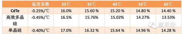 CdTe组件还具有良好的弱光特性和温度系数,组件工作温度一般在45℃以上,此条件下CdTe组件效率将超过高效多晶硅,当工作温度超过65℃时,则CdTe效率与单晶相当。同样标称功率的条件下,CdTe的发电量将比传统多晶硅组件高出5-10%。