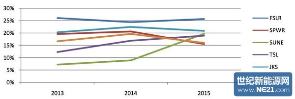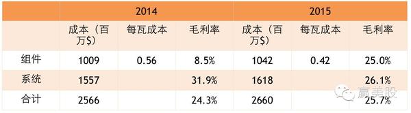 (注: 组件业务包括公司电站自用和向第三方销售,系统业务不包含组件部分收入)公司利润的增长主要来自组件成本的下降,这得益于公司产能利用率的提高,由 2014年的81%提高到2015年的92%,组件平均成本由$0.56/w下降至$ 0.42/w,毛利率由8.5%提高至25%。