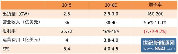 根据公司盈利指引,2016年公司出货量将进一步提高到2.9-3.0GW(增长16%-20%),收入38-40亿美元(增长5.6%-11.1%),EPS 4.0-4.5(下降15%-24%)。