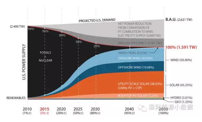 索比光伏网讯:2050年美国能源供应100%来自可再生能源(水、风能、太阳能)可能实现吗?美国斯坦福大学学者MarkZ.Jacobson坚定的认为这是可行的,有下面的路线图为证: