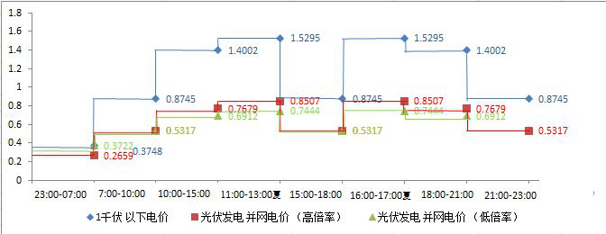 在这个方案中,高倍率方案下10:00至15:00点之间,光伏上网价格为0.7679元每千瓦时,在低倍率方案,价格为0.6912元每千瓦时。