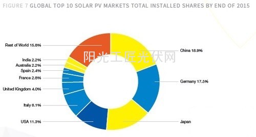 报告称尤其是中国、日本和美国,2015年引领了全球光伏市场的增长,仅中日两国就占全球整体新导入设备容量的50%。欧洲市场2015年新并网的设备容量为8.2GW,市场年增长率为15%。