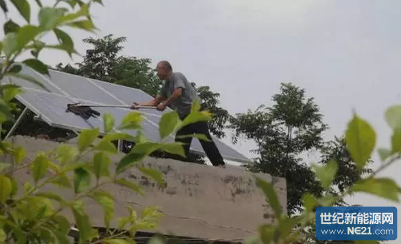 如图所示,这位山东淄博的老人正在屋顶擦拭着电池板。