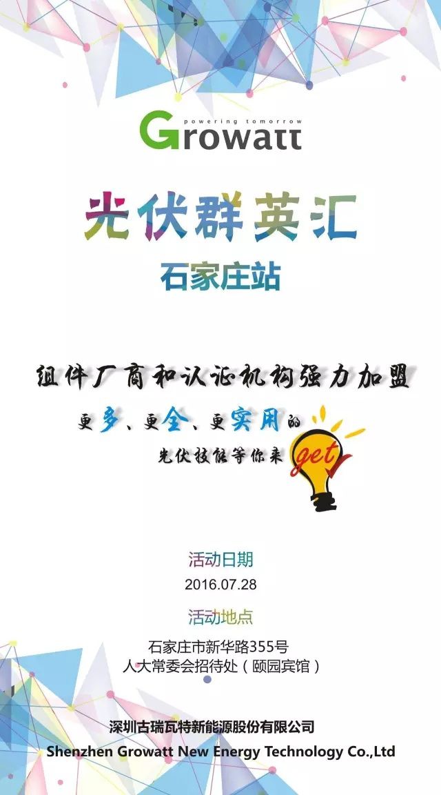 炎热的夏季,太阳像火一样燃烧,热,成了每天的家常便饭,但是更热的,是光伏人的那颗火热的心,那颗孜孜不倦地追求光伏知识的心,古瑞瓦特光伏群英汇,聚集的正是这样一群“热血”的光伏英雄豪杰。古瑞瓦特群英汇旨在聚集行内精英,交流和探讨光伏实际应用中的点点滴滴,分享技术观点以及成功经验,共同推动光伏应用知识的普及化和实用化。上月在江城武汉举办的首届光伏群英汇取得了圆满成功,获得了参会者的一致好评,大家都在期待下一场光伏群英汇的举办。正所谓“千呼万唤始出来”,本月28日,如之前所预告,古瑞瓦特光伏群英汇将在河北省会石家庄的人大常委会招待处(颐园宾馆)隆重召开,本次除了古瑞瓦特精英团队经过全新优化和设计的精彩主题之外,更邀请了组件厂商和认证机构强力加盟,为各位来自光伏界的英雄豪杰奉献更多、更全、更实用的光伏技术干货,加强各方的交流与合作,为推动光伏行业的健康发展出一点力。本次光伏群英汇活动已全面开启,报名正火热进行中,7月28日,我们在石家庄相汇!