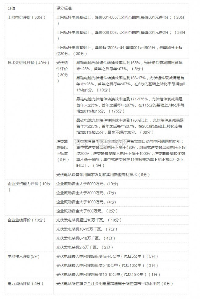 第十一条 评选内容包括上网电价评价、技术先进性评价、企业投资能力和业绩评价、电网接入评价、电力消纳评价和履行社会责任评价等六个部分的内容,详见附件《内蒙古自治区普通光伏电站项目优选评分标准》。