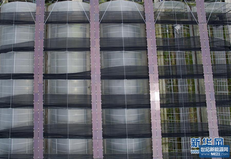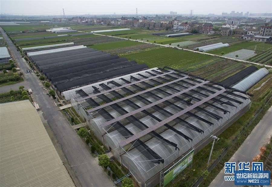 杭州市萧山区益农沙地绿色纯品瓜果蔬菜试验场育秧大棚顶上的光伏设备(7月14日摄)。新华社记者黄宗治摄