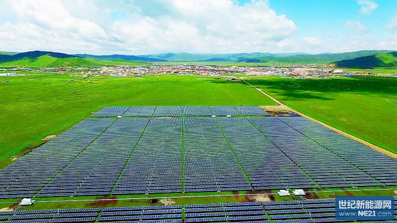 红原县邛溪镇花海光伏发电站采取了环保建设方式,牧草在电站内依然茁壮生长。