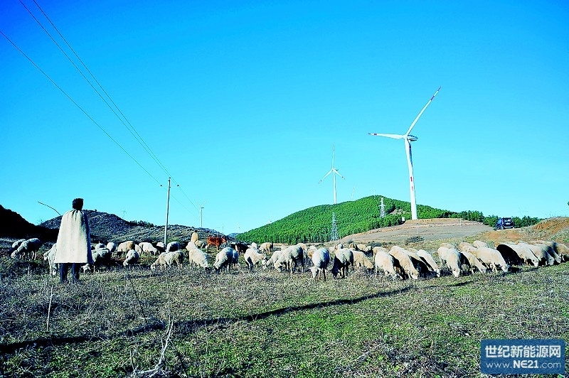 凉山州会东县拉马风电场外,彝族群众正在放羊。该项目年发电量将达到22452.6万千瓦时,每年可节约标煤近7万吨。