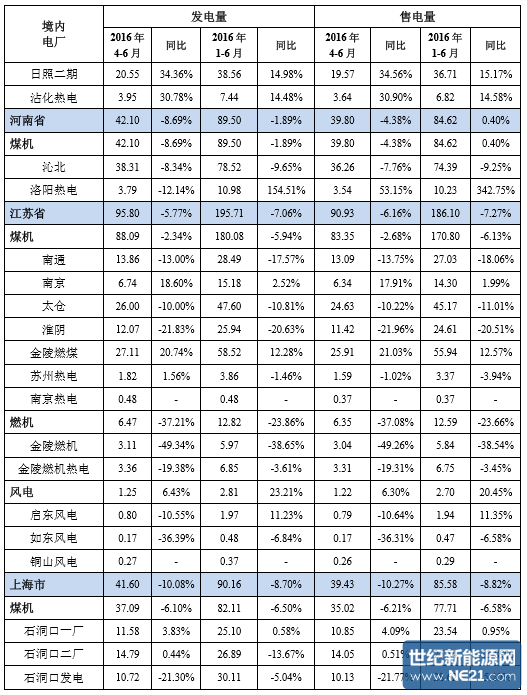 根据华能国际电力股份有限公司的初步统计,2016 年第二季度,中国境内各运行电厂按合并报表口径完成发电量 692.20 亿千瓦时,同比下降 10.43%;完成售电量 653.51 亿千瓦时,同比下降 10.06%;2016 年上半年,中国境内各运行电厂按合并报表口径累计完成发电量 1,460.80 亿千瓦时,同比下降 8.60%;完成售电量 1,380.75 亿千瓦时,同比下降 8.35%;2016 年上半年中国境内各运行电厂平均上网结算电价为 394.46 元/兆瓦时,同比下降12.37%。