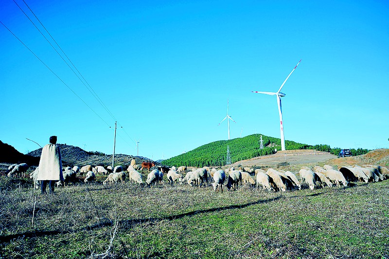凉山州会东县拉马风电场外,彝族群众正在放羊。该项目年发电量将达到22452.6万千瓦时,每年可节约标煤近7万吨。