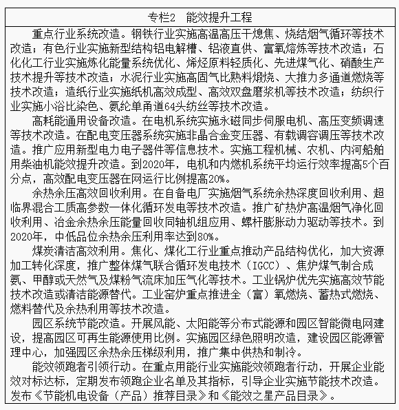 以先进适用技术装备应用为手段,强化技术节能。全面推进传统行业节能技术改造,深入推进重点行业、重点企业能效提升专项行动,加快推广高温高压干熄焦、无球化粉磨、新型结构铝电解槽、智能控制等先进技术。继续推进锅炉、电机、变压器等通用设备能效提升工程,组织实施空压机系统能效提升计划。围绕高耗能行业企业,加快工艺革新,实施系统节能改造,鼓励先进节能技术的集成优化运用,推广电炉钢等短流程工艺和铝液直供,推动工业节能从局部、单体节能向全流程、系统节能转变。提升产品的轻量化水平,推广复合材料、轻合金、真空镀铝纸等高强韧度新型材料,推广超高强度钢热冲压成形技术、真空高压铸造、超高真空薄壁铸造等轻量化成形工艺。普及中低品位余热余压发电、供热及循环利用,积极推进利用钢铁、化工等行业企业的低品位余热向城市居民供热,促进产城融合。实施工业园区节能改造工程,加强园区能源梯级利用,推进集中供热制冷。