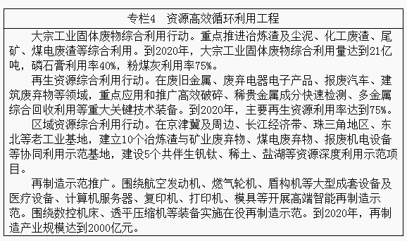 大力推进工业固体废物综合利用。以高值化、规模化、集约化利用为重点,围绕尾矿、废石、煤矸石、粉煤灰、冶炼渣、冶金尘泥、赤泥、工业副产石膏、化工废渣等工业固体废物,推广一批先进适用技术装备,推进深度资源化利用。深入推进承德、朔州、贵阳等资源综合利用基地建设,选择有基础、有潜力、产业集聚和示范效应明显的地区,合理布局,突出特色,加强体制机制和运行管理模式创新,打造完整的工业固体废物综合利用产业链。探索资源综合利用产业区域协同发展新模式,发挥各地优势,推动区域资源综合利用协同发展,实施京津冀地区资源综合利用产业协同发展行动计划,建立若干工业固体废物综合利用跨省界协同发展示范区。